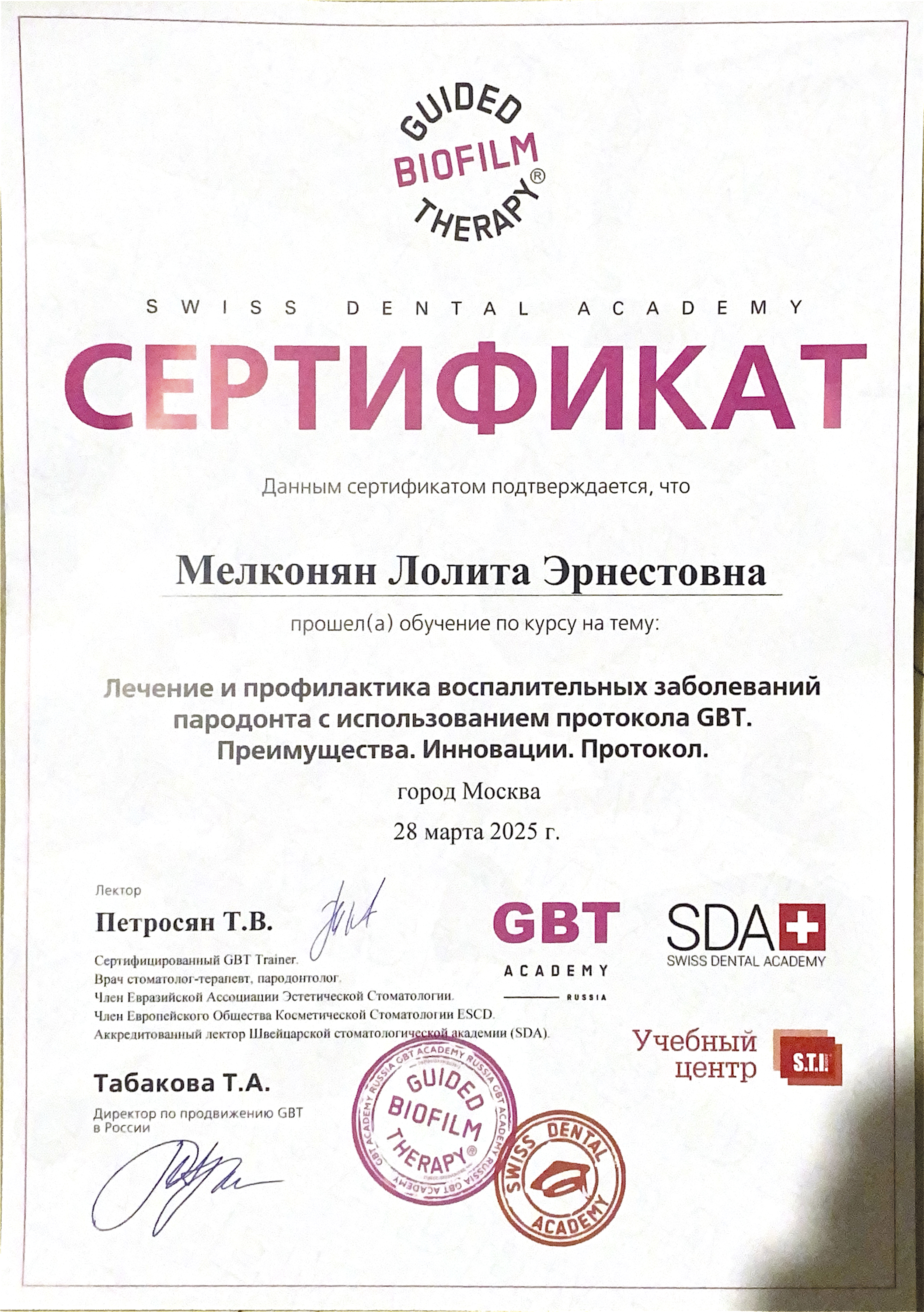 - 2025г - Лечение и профилактика воспалительных заболеваний пародонта с использованием протокола GBT. Преимущества. Инновации. Протокол. Петросян Татьяна Валериевна